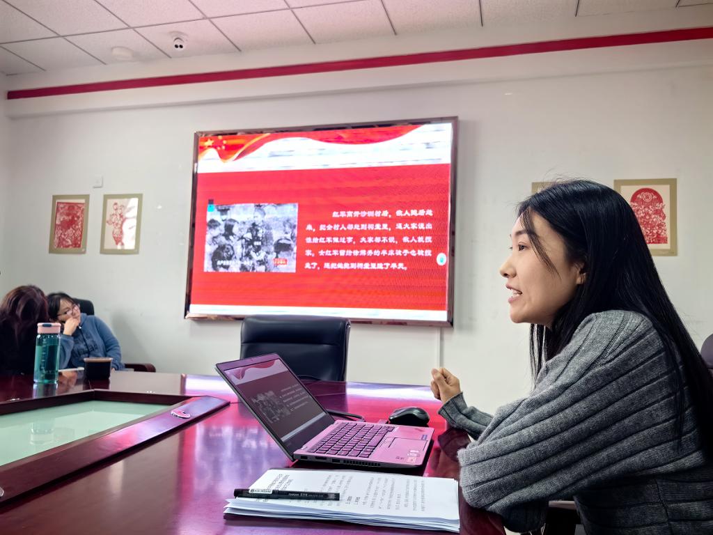 最后,孙诗嘉同志为大家讲了“半条被子的故事”微党课。孙老师娓娓讲述,将大家带入到故事情节中,体会徐解秀与红军战士的鱼水情深,体会中国共产党同人民风雨同舟、血脉相通、生死与共的伟大信仰。