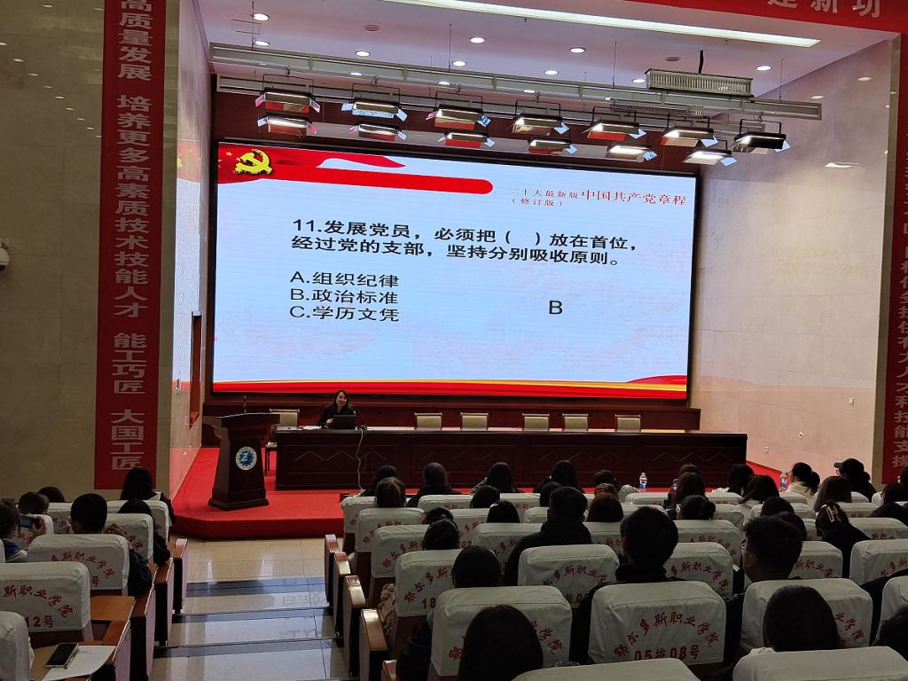 杨梅以测试题的形式开讲,就《党章》的重要性、产生、主要内容等进行了说明,并结合学院和系里的党建活动,从学生日常行为入手对学生进行了思想教育,帮助他们提高政治站位。