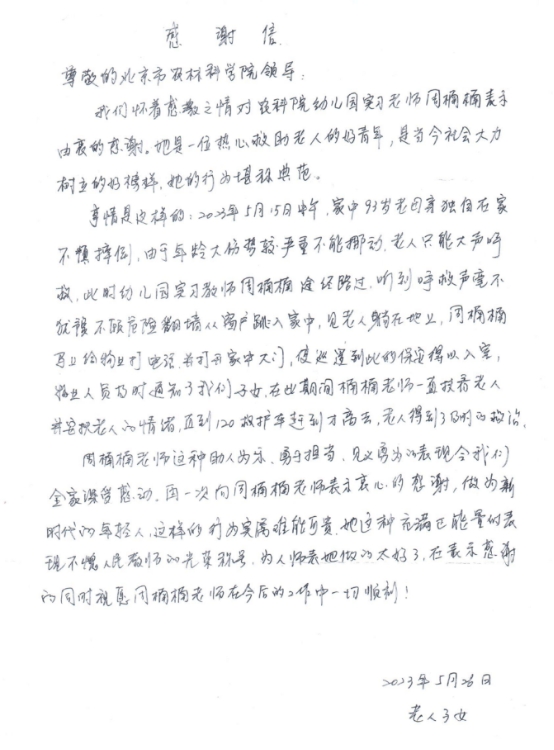5月26日,被救老人的子女向周楠楠同学实习的单位送来《感谢信》,并对周楠楠同学表示衷心地感谢,对周楠楠同学勇于担当、见义勇为的高尚品德表示敬意,夸赞周楠楠是人民的好老师,充满着正能量。