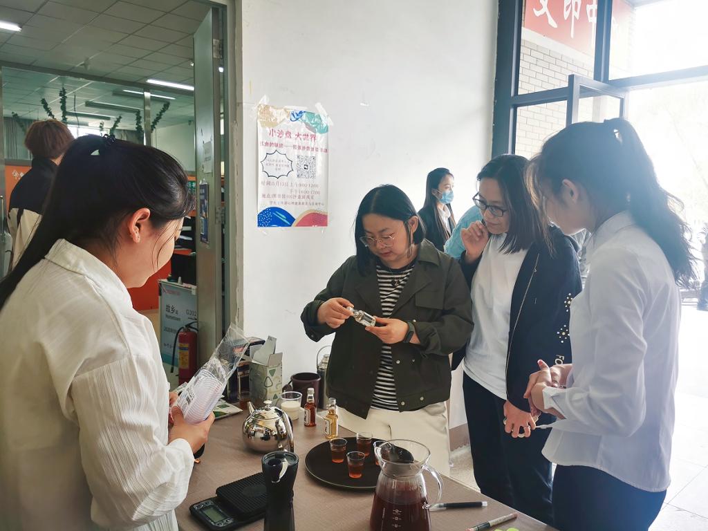 活动以现场讲解、咖啡品鉴和实际动手体验相结合的方式进行,四个展位分别演示四种精品咖啡冲泡技艺,即手冲咖啡、摩卡壶冲泡、冰滴咖啡和法压壶冲泡。学生们一边演示一边讲解,广大师生一边品尝一边聆听,大家对咖啡的烘焙类型、研磨度及各类咖啡器具萃取冲煮等知识有了新的了解。学生们现场研磨、现场萃取,制作出的黑咖啡、生椰拿铁、肉桂苹果拿铁、香橙拿铁等,受到了广大师生的一致好评。指导老师邢博超组织大家将品鉴感悟写下来,贴在展位的展板上,准备进行实训后的教学反思,以更进一步提升学生实践操作能力。