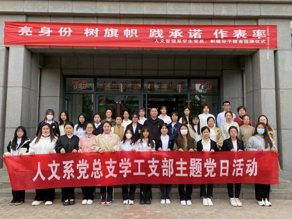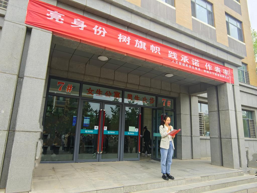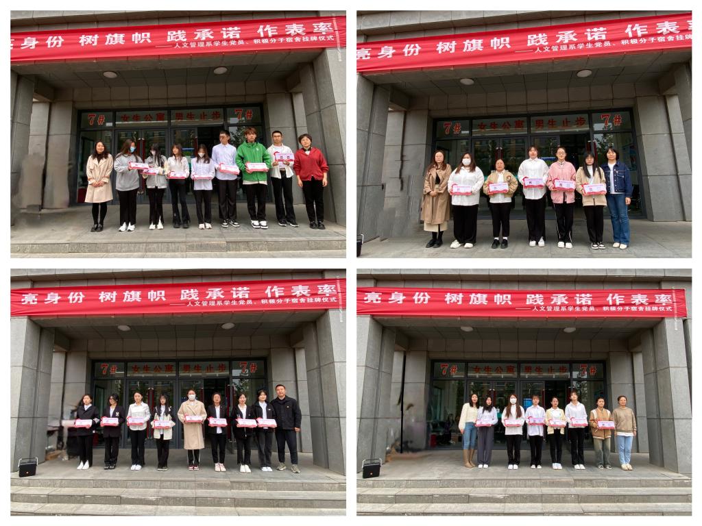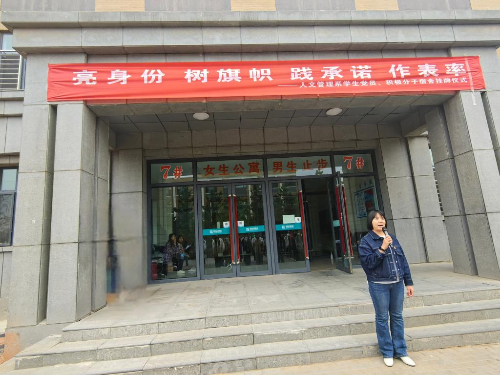 为深入理解党的二十大的精神,将党的二十大精神贯彻落实到实际工作生活中,进一步推进党建进宿舍工作,提升人文管理系宿舍管理质量,充分发挥系部学生党员、入党积极分子的模范带头作用。2023年5月9日,人文管理系开展“亮身份 树旗帜 践承诺 作表率”学生党员、入党积极分子宿舍挂牌仪式暨主题党日活动。人文管理系党总支书记、主任杨梅,党总支副书记高慧、学生与综合管理科科长王磊、学工支部全体党员、发展对象和入党积极分子及22级各班学生代表参加本次活动。
