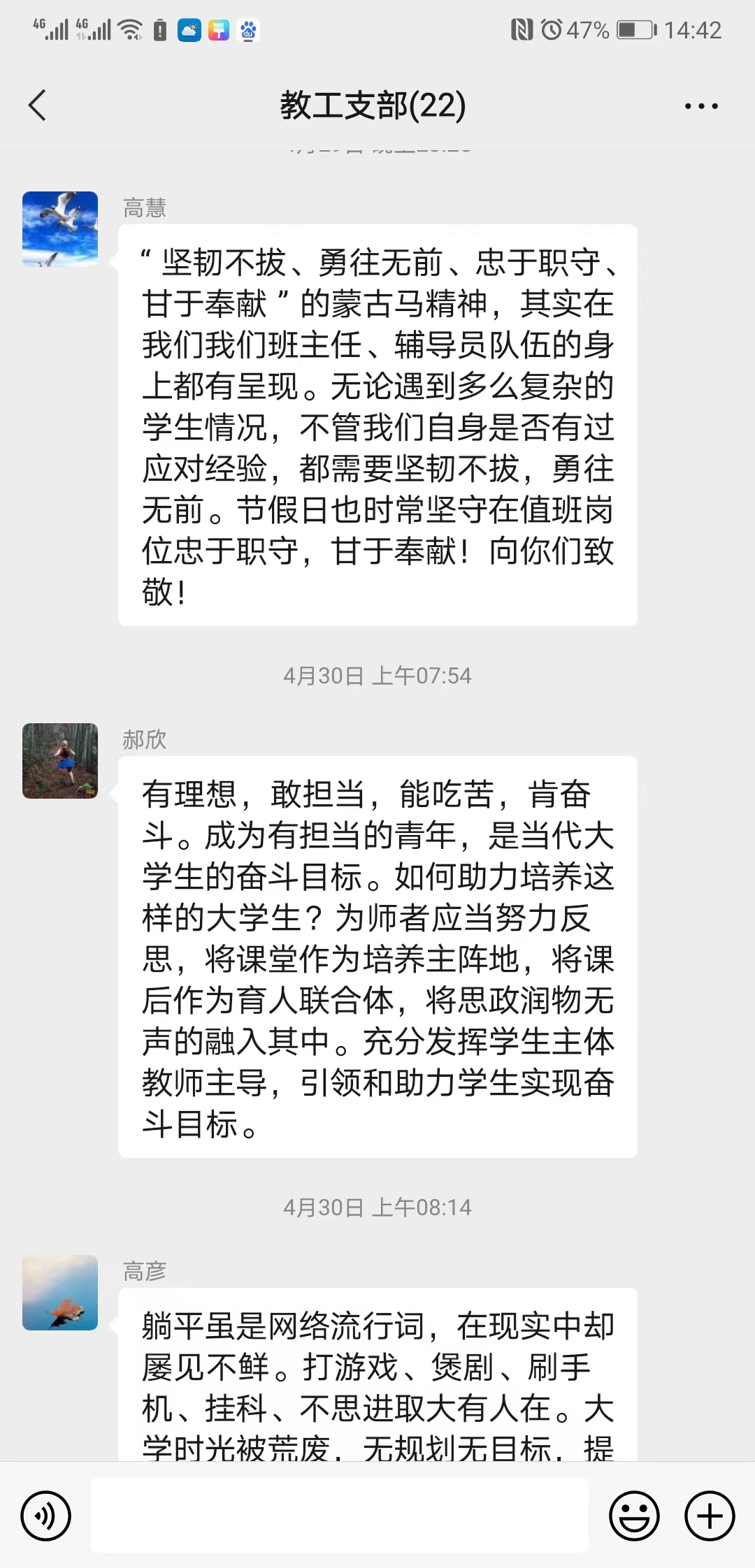 党总支副书记高慧:“坚韧不拔、勇往无前、忠于职守、甘于奉献”的蒙古马精神,其实在我们班主任、辅导员队伍的身上都有呈现。无论遇到多么复杂的学生情况,不管我们自身是否有过应对经验,都需要坚韧不拔,勇往无前。节假日也时常坚守在值班岗位忠于职守,甘于奉献!向你们致敬!
