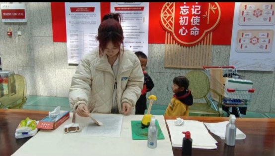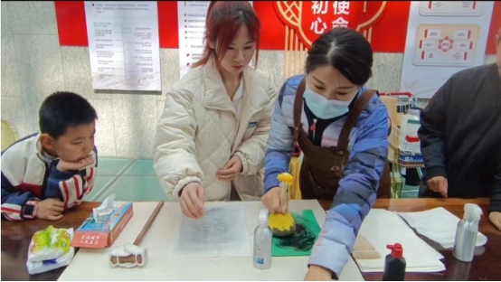 张学慧同学按照工作人员的工作步骤指导,创作出属于自己的拓片。