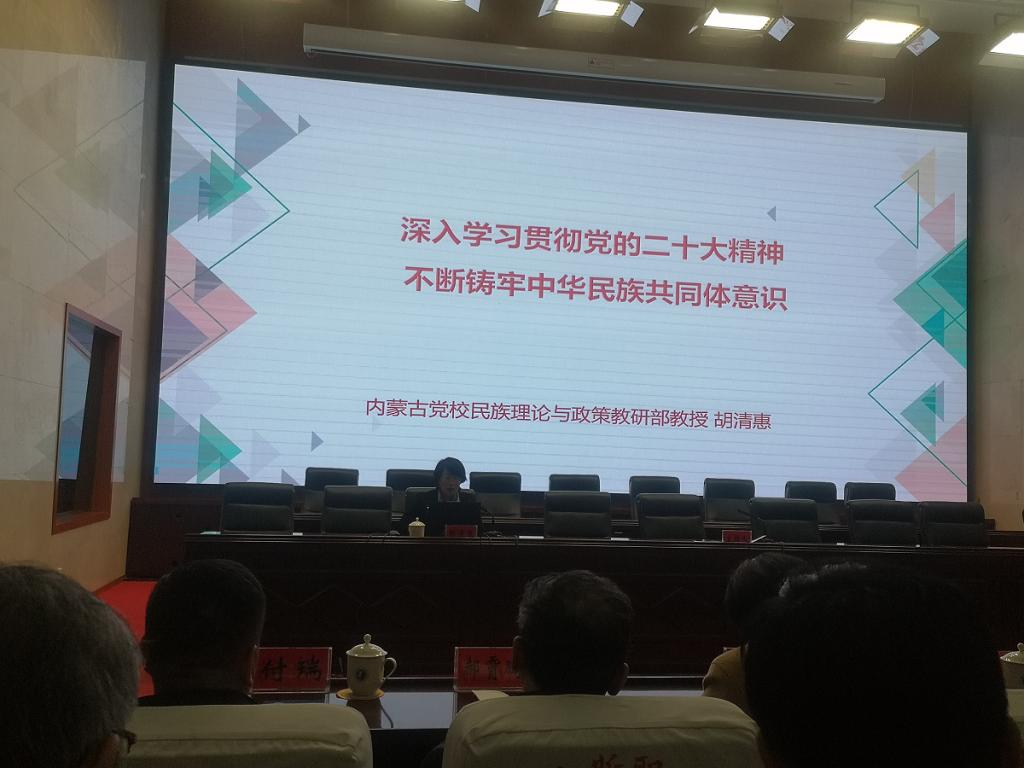 与会人员聆听乐太原师范学院王林义教授所作的题为《坚定文化自信》和内蒙古党校民族理论与政策教研部胡清惠教授所作的关于铸牢中华民族共同体意识为主题的专题讲座。王林义教授从什么是文化自信,文化自信的意义和价值,如何坚定文化自信三个方面进行了深入细致的解读。胡清惠教授从增强铸牢中华民族共同体意识的思想自觉、行动自觉两方面进行了详细讲解。