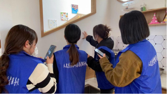 同学们到达春田花花托育中心后,分成两组 ,第一组的同学对厨房墙面进行设计,第二组的同学对鞋柜进行测量设计。