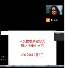 12月5日,人文管理系党总支采用线上线下的方式开展第14次集中学习。人文管理系全体党员教师参加会议。会议由党总支书记杨梅主持。