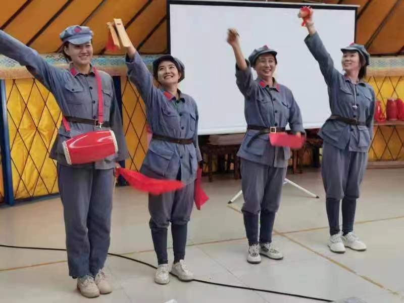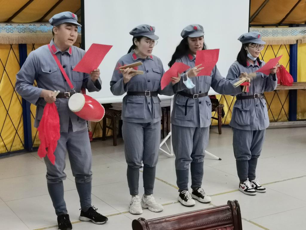 在互动教学环节,教师们积极参与到喜迎二十大主题活动中来,围绕红歌大比拼、朗诵《百年华彩》、快板《红色基因代代传》等节目,运用唱红歌、颂经典、团队合作等形式了解革命历史,感受共产党发展的艰难历程,领会革命精神,用红色文艺点燃激情,为迎接党的二十大胜利召开营造氛围。