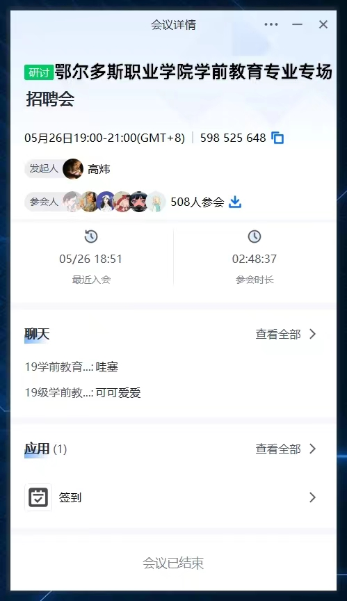 启动招聘,提供机会。5月26日,人文管理系联合学院招就处通过腾讯会议召开线上招聘会,为未就业学生提供就业机会和平台,积极促进就业。线上招聘会上,我系裴燕老师联合东胜区星河幼儿园常务园长熊敏、东胜区小太阳幼儿园保教主任赵茹月、东胜区红黄蓝成长中心园长李思彤、 呼和浩特悦生花幼儿园园长郝华、包头市青山区蒙台梭利松石国际园园长王霞、内蒙古千力教育咨询有限公司运营总监吕志明等6家单位的负责人分别进行招聘宣讲,突出各单位在文化建设、工作环境,招聘岗位、任职要求、人文关怀等方面的优势,并与300多位毕业生就大家关心的员工待遇、面试等问题进行了交流。