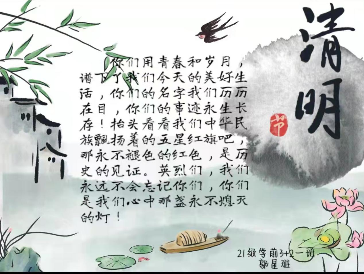 落雨山青秀,时节情悲伤。4月5日是中国的传统节日清明节。为进一步表达对烈士、亲人的缅怀之情,人文管理系党总支用线上主题党日活动的方式组织广大师生抒写“清明寄语”,用网络祭奠的形式,认知传统,弘扬传统,增进情感。