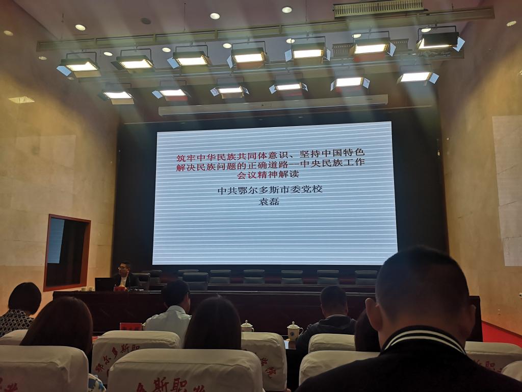 鄂尔多斯市委党校党史党建部主任袁磊围绕全面聚焦铸牢中华民族共同体意识这个新时代党的民族工作的“纲”,从我党形成了加强和改进民族工作的重要思想、重大论断——铸牢中华民族共同体意识、坚持正确的民族创新发展方向等五个方面,就中央民族会议精神的主要内容进行了解读。