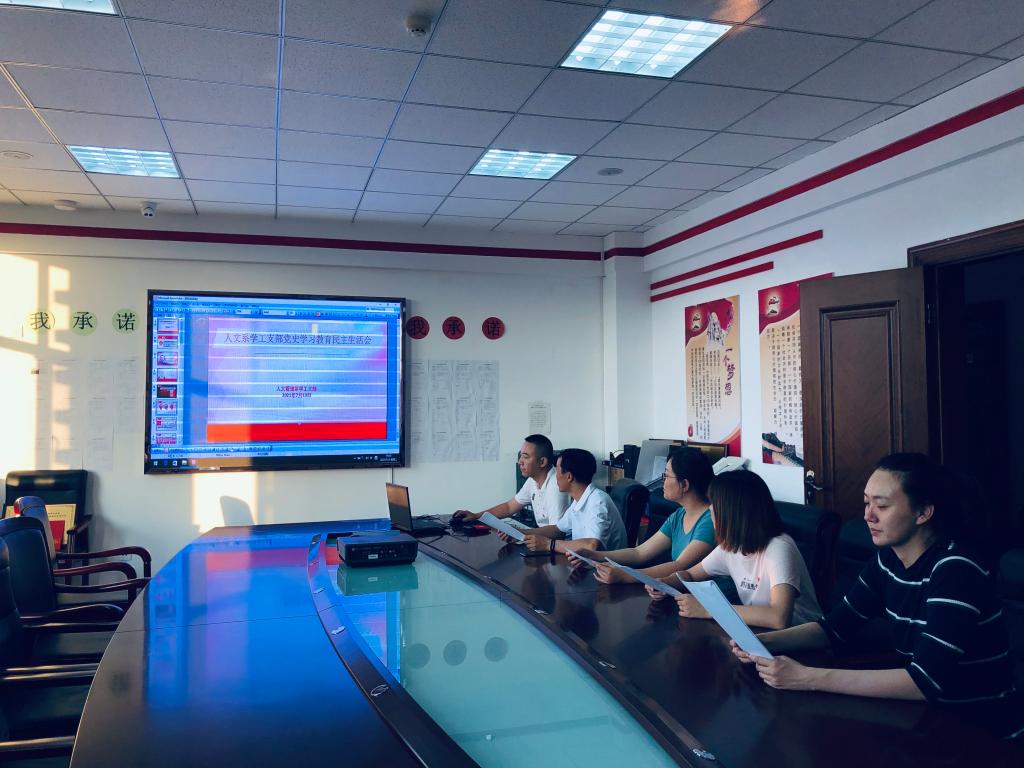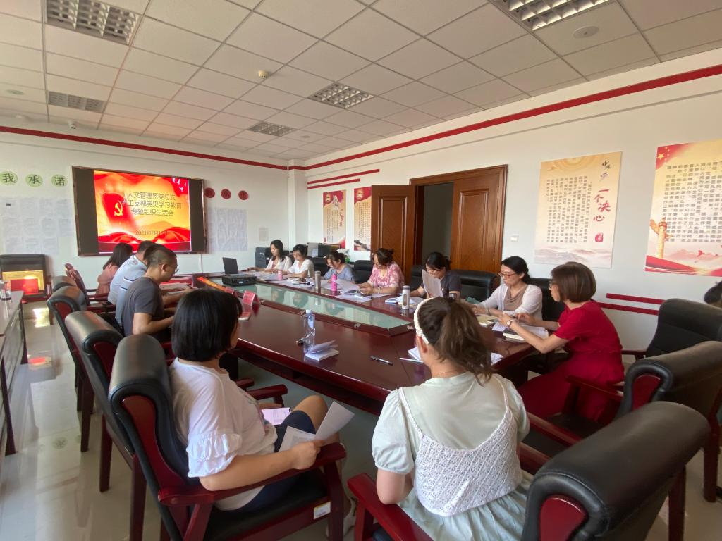 2021年7月13日下午,人文管理系党总支教工支部和学工支部组织全体党员在教研楼431会议室和410办公室分别召开党史学习教育专题组织生活会。学院党史学习教育专题组织生活会指导组成员王辉、马宁两位同志参加了教工支部专题组织生活会。