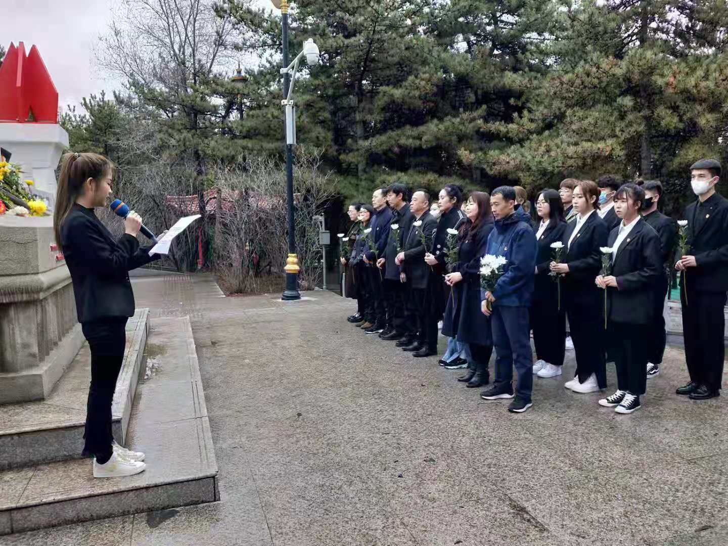 祭奠仪式现场庄严肃穆,大家默然静立,自发排成三行面向纪念碑鞠躬默哀,向革命先烈们致以崇高敬意和沉痛哀悼。学生入党积极分子安子新代表广大师生讲话。她说:“在烈士纪念碑中有共产党员,也有普通的中华儿女,他们为了保卫祖国、保卫这片神圣的土地献出了年轻的生命。也许我们无法知道所有人的名字,但他们的壮举永远激励着我们。我们应该向他们学习,向他们致敬!”最后,大家怀着崇敬的心情向烈士纪念碑敬献鲜花。