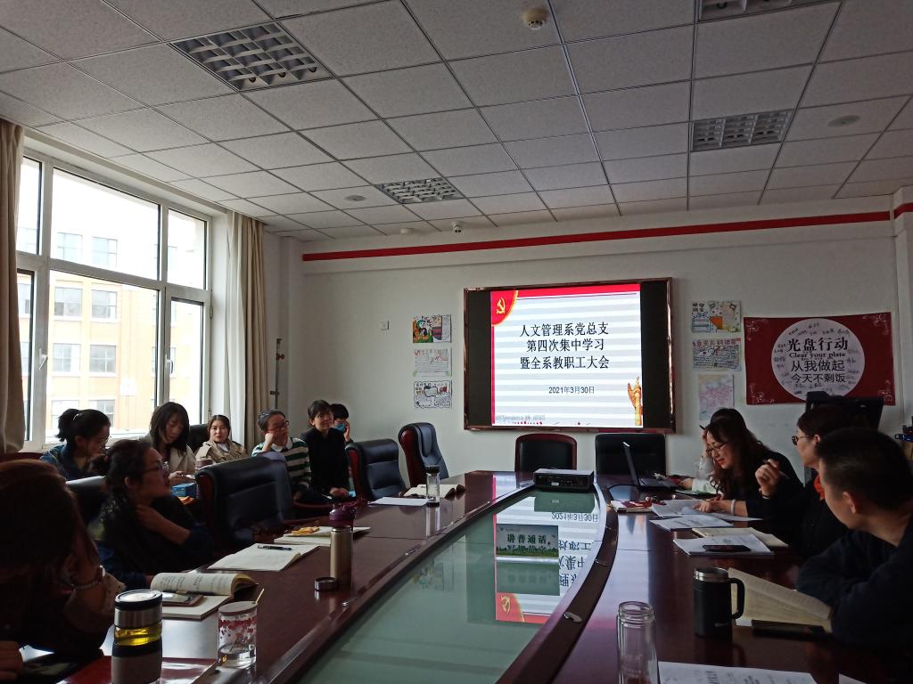 3月30日,人文管理系党总支召在教研楼431会议室组织召开第4次集中学习暨全系教职工大会。人文管理系党总支书记杨梅主持会议,系主任白玲及全体教师参加了会议。