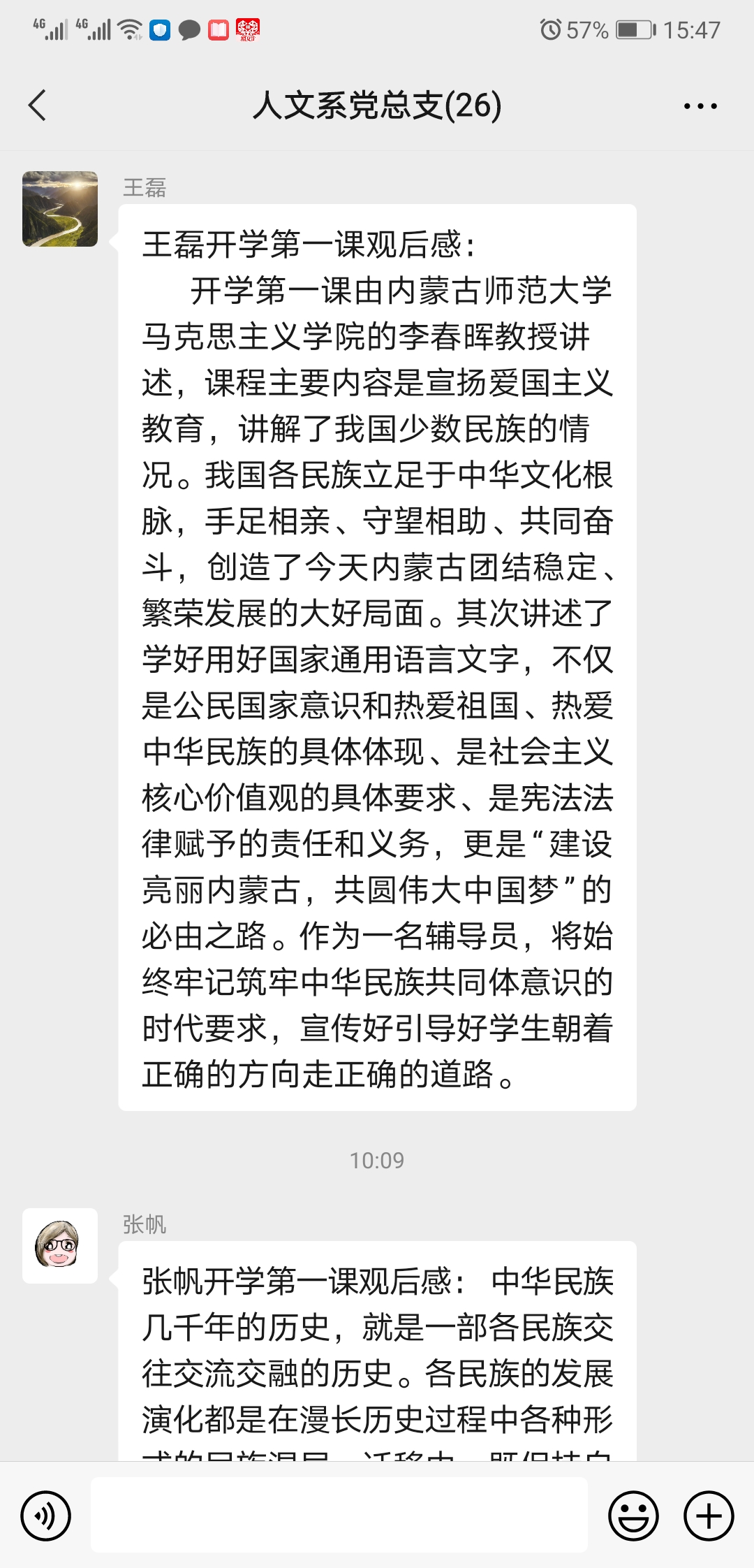 教师高彦认为:《开学第一课》是在文化自信、命运共享的中华民族共同体意识背景下展开,简洁凝练,案例、事实并举,数据详实,其中贯穿中华民族先哲已有的“和”思想令人印象深刻。作为一名大学语文老师,理应践行理论,身传言教,将铸牢中华民族共同体意识体现于日常教学工作中,传承文明,说普通话,写规范字,不断提升各族同胞的学养、素养和能力,使他们各展其才、各尽其能,为铸牢中华民族共同体意识贡献微薄力量。