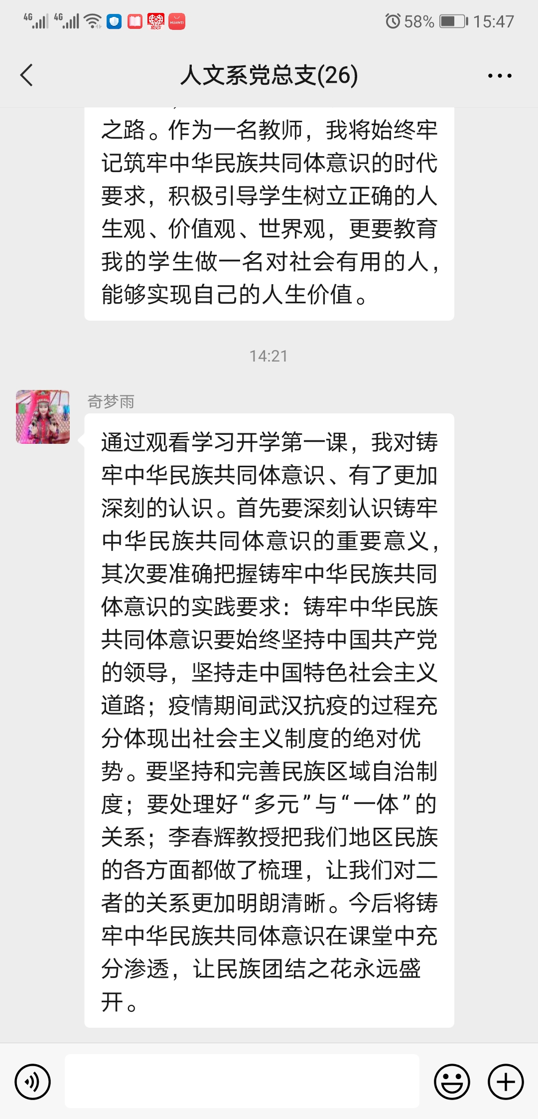 3月1日晚8点,自治区教育厅以“做铸牢中华民族共同体意识的时代新人”为主题发布了《开学第一课》,人文管理系党总支组织师生利用网络、电视进行收听收看,并开展线上分享观后感的主题党日活动。