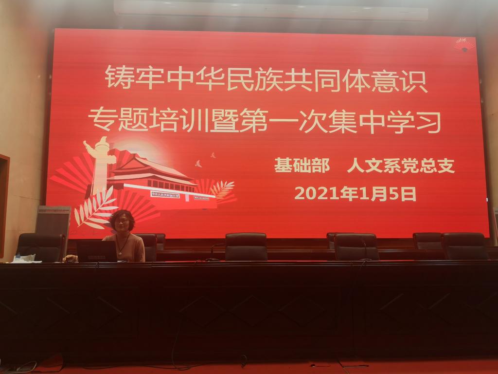 1月5日,人文管理系党总支与基础部在学院500人报告厅联合开展铸牢中华民族共同体意识专题培训暨总支第一次集中学习。基础部副部长胡喜和主持会议。人文管理系、基础部全体教职工参加会议。