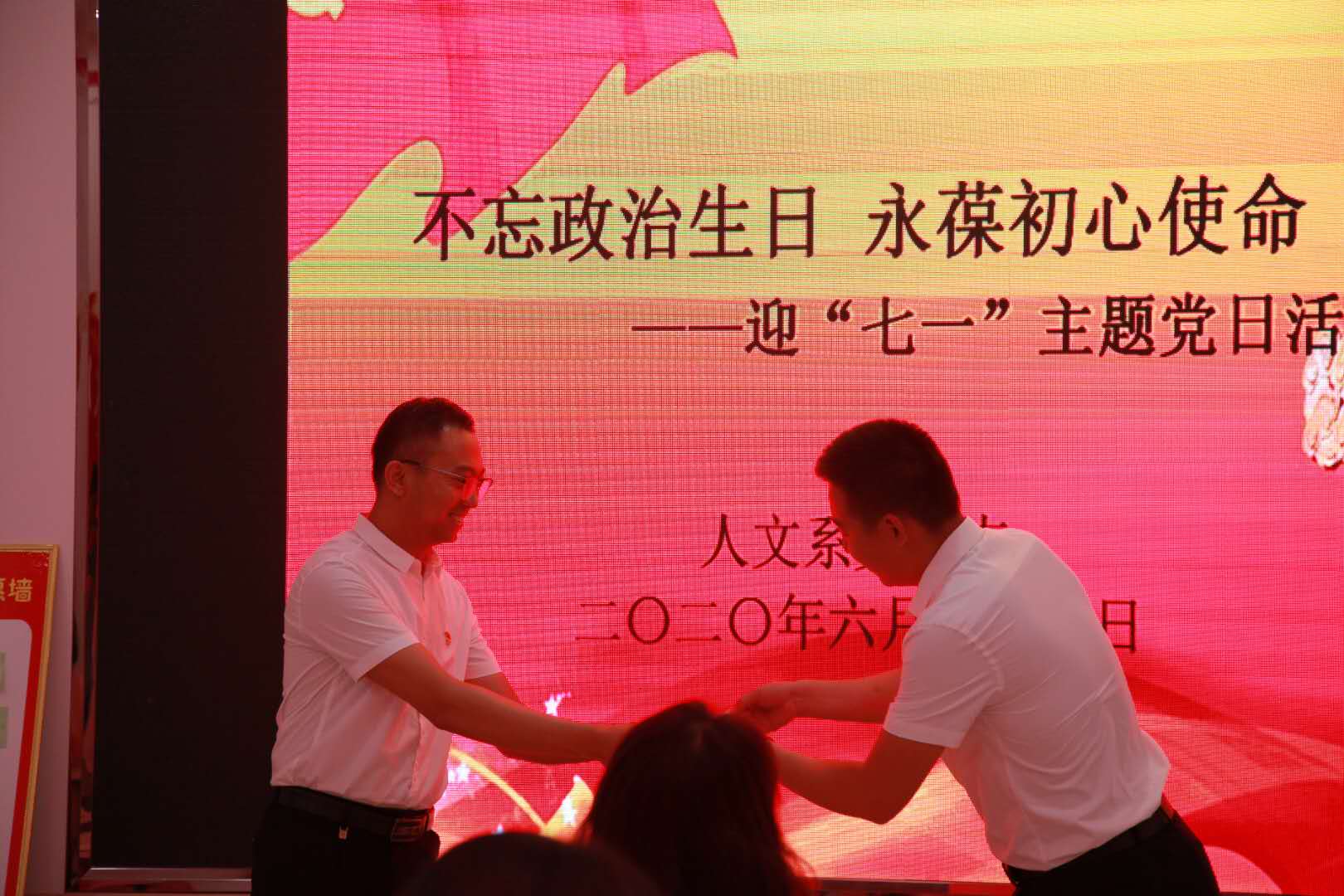 为庆祝中国共产党建党99周年,深入强化党员的身份意识和责任意识,加强党员党性教育,引导广大党员始终保持党的先进性和纯洁性,不忘初心,牢记使命,6月24日下午,人文系党总支特举办“不忘政治生日、永葆初心使命”迎“七一”主题党日活动。人文系党总支教工支部、学工支部全体党员以及部分发展对象参加了本次活动。活动由学工支部书记段泳遥主持。