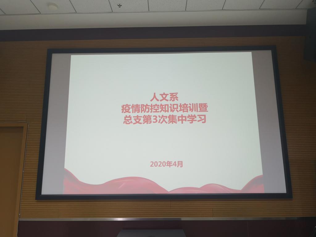 2020年4月26日下午,人文系在图书馆三楼影视厅组织疫情防控知识培训暨党总支第3次集中学习。系党总支副书记杨梅主持培训会。系主任白玲及全体教职工参加培训。