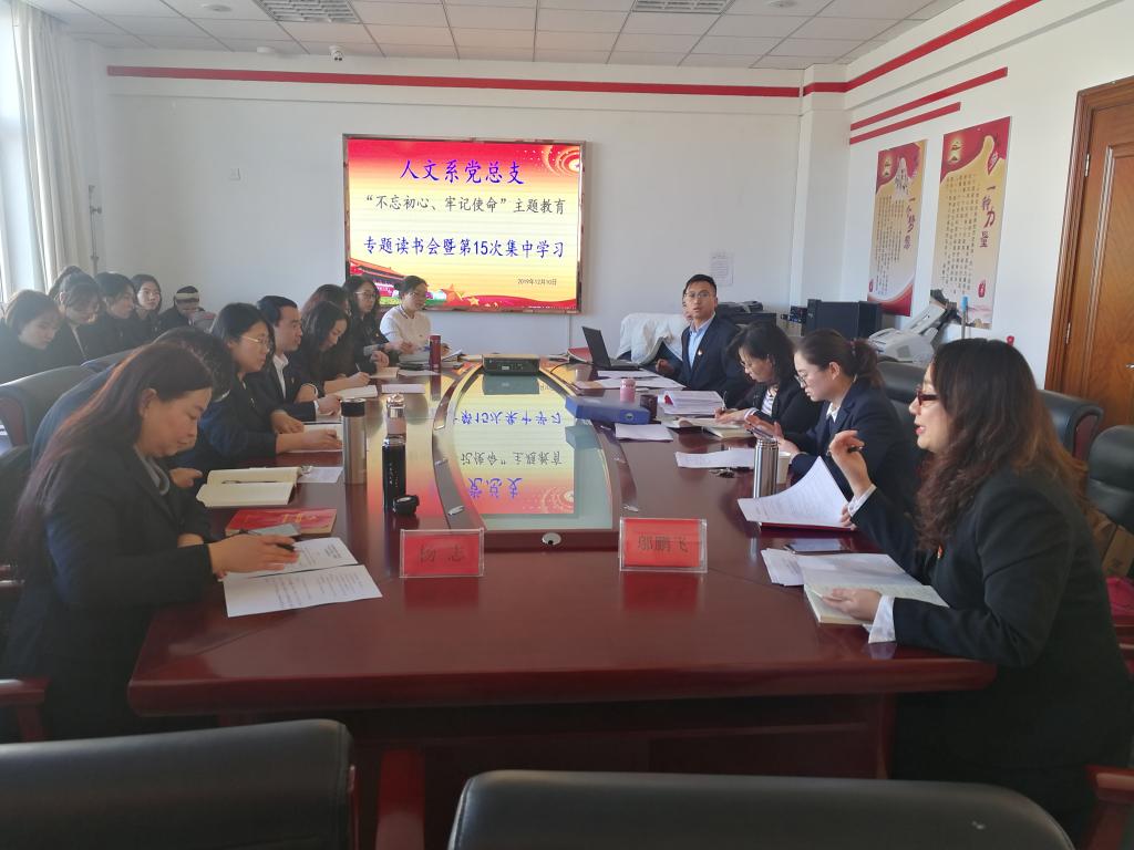 12月10日下午,人文系党总支组织召开“不忘初心、牢记使命”主题教育读书会暨第15次集中学习。人文系党总支全体师生党员参加读书会。人文系党总支组织委员朱必云主持会议。