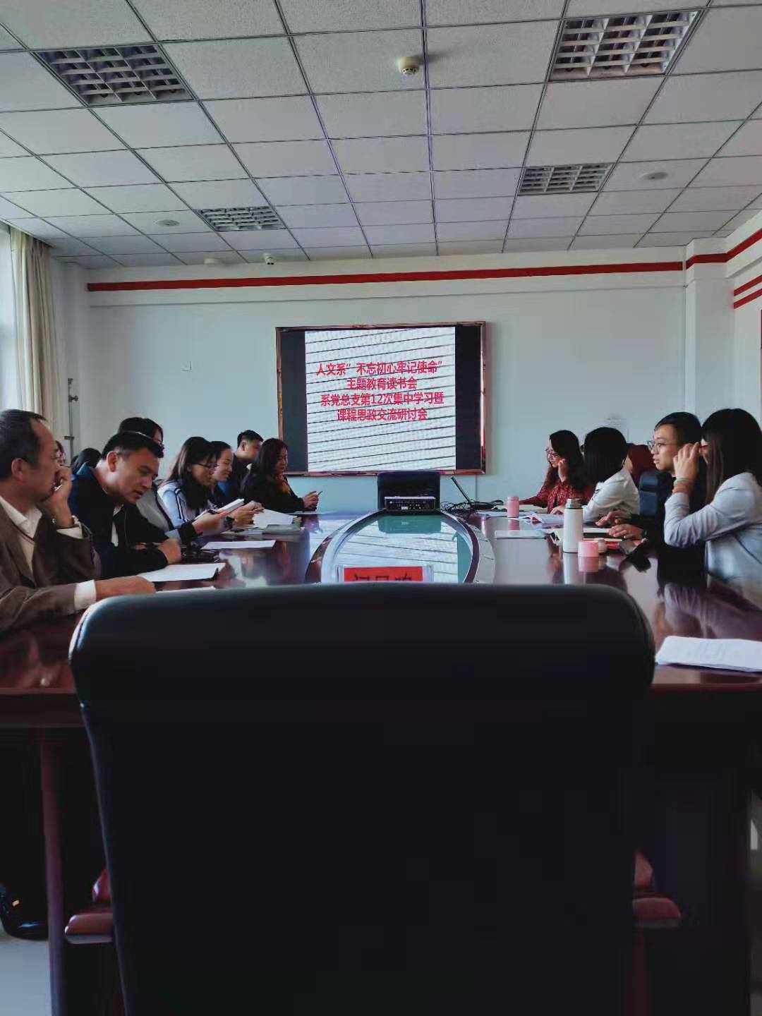 2019年10月22日,人文系在教研楼431组织开展“不忘初心、牢记使命”主题教育读书会、系党总支第12次集中学习暨课程思政交流研讨会。学院党委书记闫凤鸣出席了本次会议。人文系全体教师参加了会议。