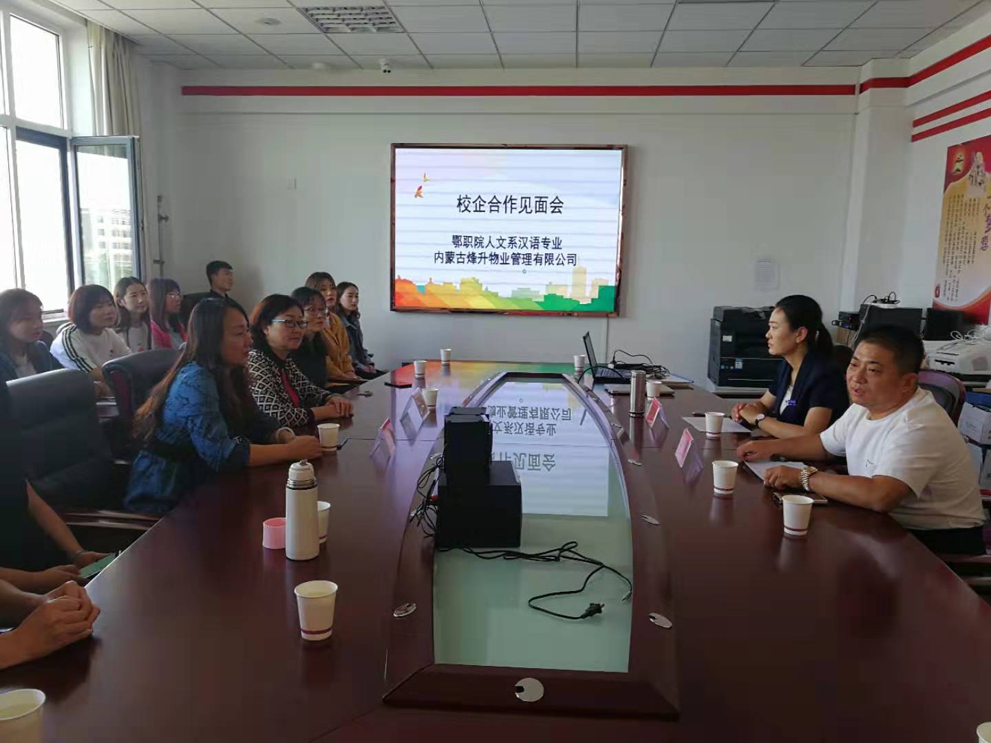 内蒙古烽升物业有限公司董事长王炳菲与项目经理窦巧连,分别就企业概况及用工需求作了介绍,并针对汉语专业团队教师、学生的提出的问题进行了回答。人文系主任白玲、副书记书记杨梅代表人文系发言。双方就如何完善汉语人才培养方案,落实理实一体化教学,搭建校企合作平台等相关问题进行了深入交流。