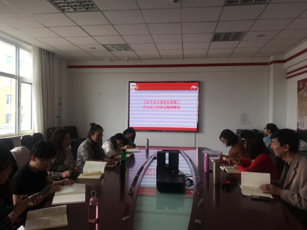 人文系党总支宣传委员张帆同志对习近平总书记在宣传思想工作上的讲话精神作讲解。她从意识形态工作是一项极端重要的工作,巩固马克思主义在意识形态领域的主导地位,党性和人民性从来都是一致的、统一的,弘扬主旋律、传播正能量和讲好中国故事、传播好中国声音这五个方面解读了新形势下宣传思想工作的重要性。