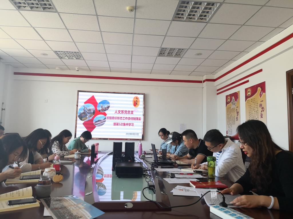 4月23日,人文系党总支在教研楼431会议室组织开展加强意识形态责任制落实专题培训暨第5次集中学习。本次会议由人文系党总支副书记杨梅同志主持。人文系全体教师党员参加了会议。