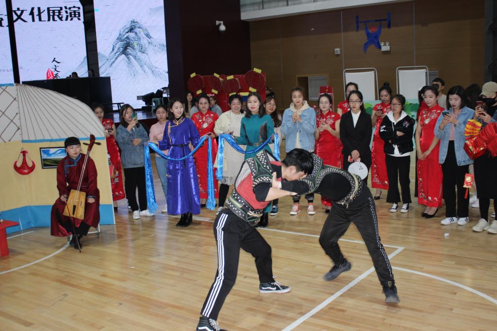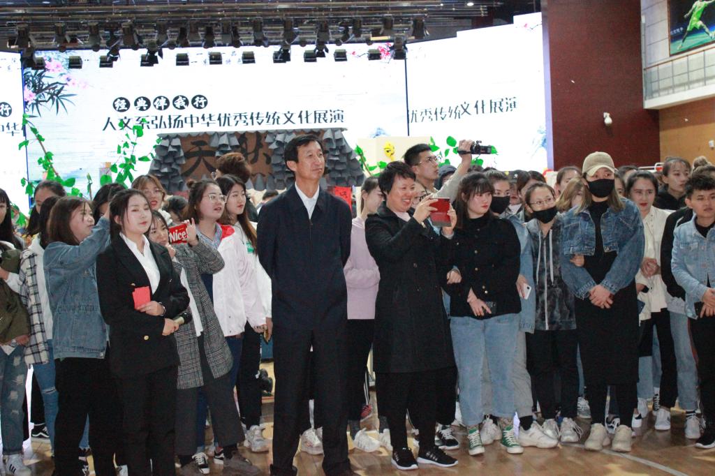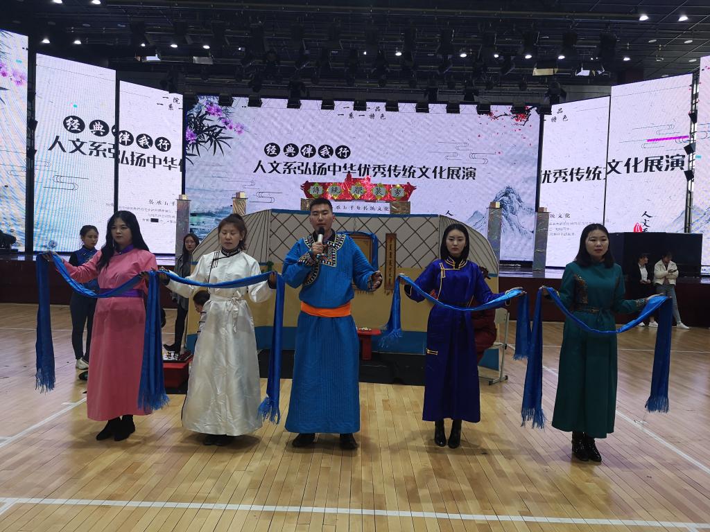 品味国粹经典,弘扬中华文化。为深入贯彻落实学院关于“一月一展演,一系一特色”的部署和要求,人文系结合本系特点,围绕传承中华优秀传统文化这个主题,于2019年3月28日下午六点在学院文体中心开展“经典伴我行——中华优秀传统文化展演”活动。学院党委书记闫凤鸣,党委委员、副院长陶文辉,党委委员、宣传部副部长付瑞,人文系主任白玲,学工部副部长刘辉,人文系党总支副书记杨梅,鄂尔多斯电视台新闻综合频道刘洋、乔宽、马卫娟及学院部分老师现场观看了本次展演。