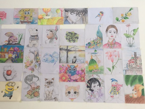 美术老师敖国欣说:“能认真上完简笔画课程的同学必然是有恒心有毅力的,画简笔画有点像学英语,一个学期下来,多数同学至少是过了三级的,单词(单体)记得很不错,造句(组合)也可以,就是写文章(画)还得继续锤炼锤炼。这次展出的作品就是对大家的一个认可。”