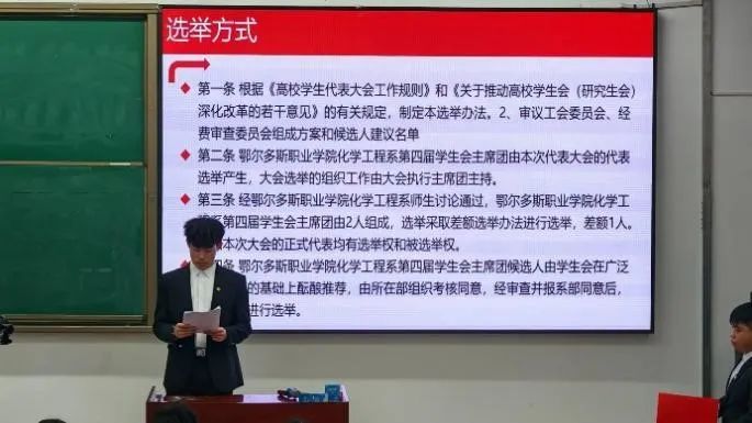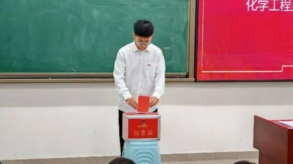 第二次全体会议通过大会选举办法(草案);通过化学工程系第四届学生会主席团候选人建议名单(草案);通过大会总监人、监票人、计票人建议名单(草案);并进行了大会选举。总监票人、监票人、以及计票人认真填写选票后,上台投入投票箱进行示范,各班代表依次上台进行投票。