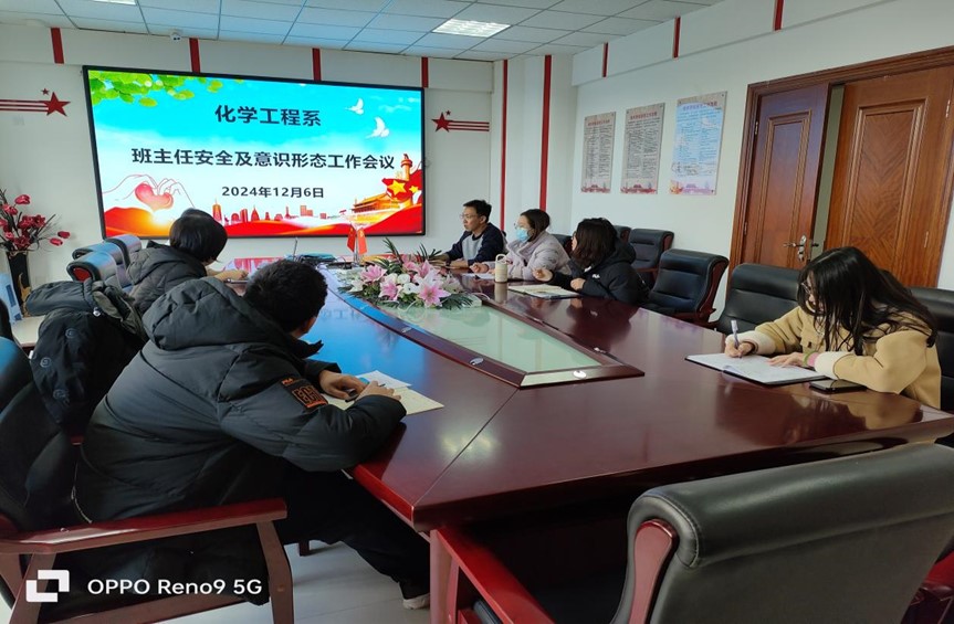 为扎实做好学生安全及日常管理工作,12月6日,化学工程系在教研楼230召开了班主任安全及意识形态工作会议。会议由化学工程系党总支副书记朱晴主持,学工科、教务科科长张乾、专职辅导员张晓东、余雨晴及无课班主任参加了会议。