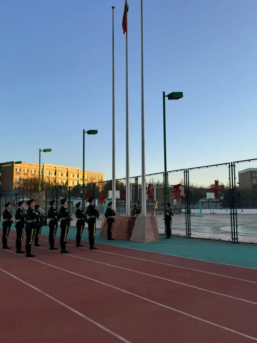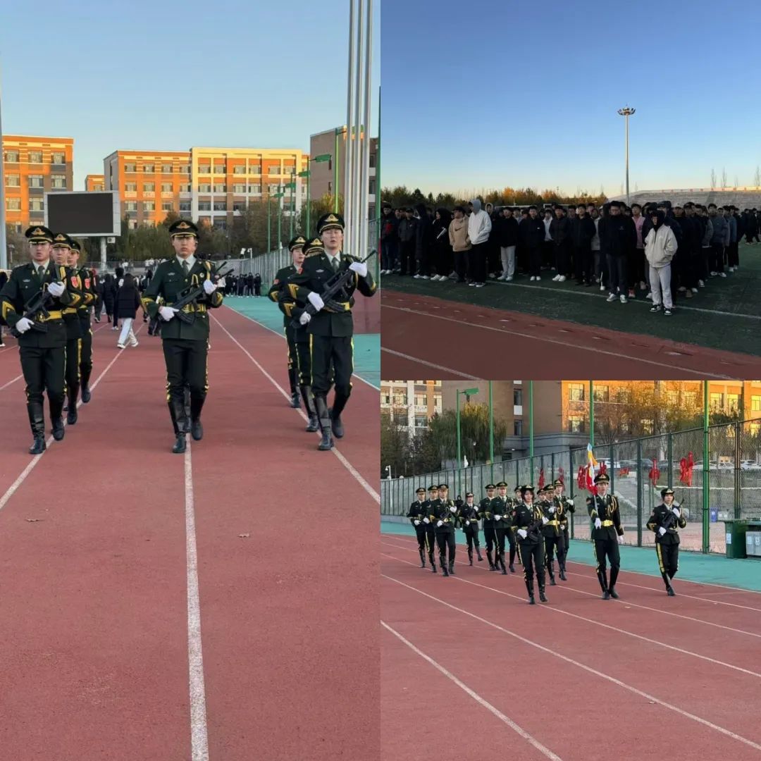 国旗护卫队迈着整齐划一、铿锵有力的步伐,护卫着国旗向着升旗台进发。他们身姿挺拔,每一步都精准无误,每一个动作都饱含着对国旗的敬重和对祖国的热爱。紧接着在全体学子的注目下和雄浑激昂的国歌声中,鲜艳的五星红旗缓缓升起。