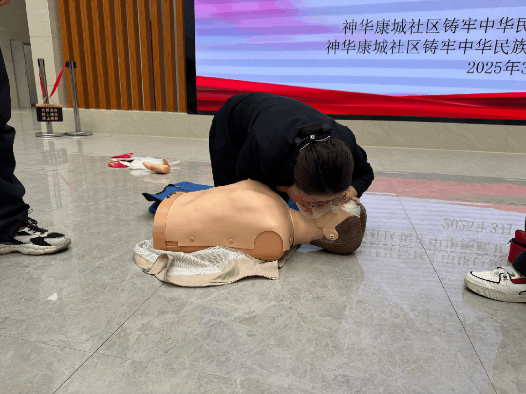 活动现场,资源工程系团总支应急救护服务队的志愿者们凭借专业知识,为社区居民带来了一场实用且生动的应急救护知识普及应急救护技能培训活动。志愿者们详细讲解并现场演示了心肺复苏、海姆立克急救法、人工呼吸、骨折包扎以及三角巾使用等一系列常见且关键的应急救护知识与技能。