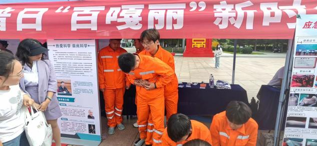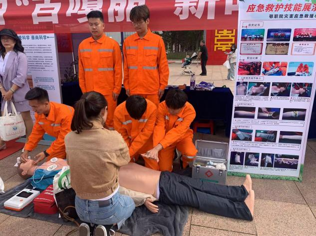 在展区中,我院资源工程系应急救援小队展示了心肺复苏,气道梗阻,包扎止血等常用急救技能,队员们的耐心讲解,吸引了很多现场观众积极体验。