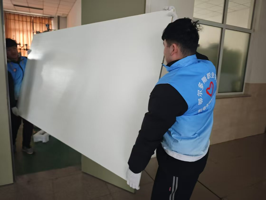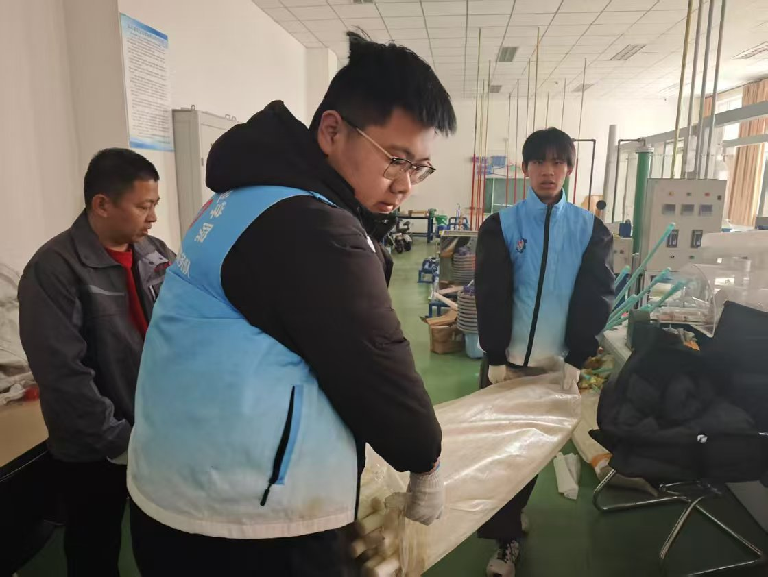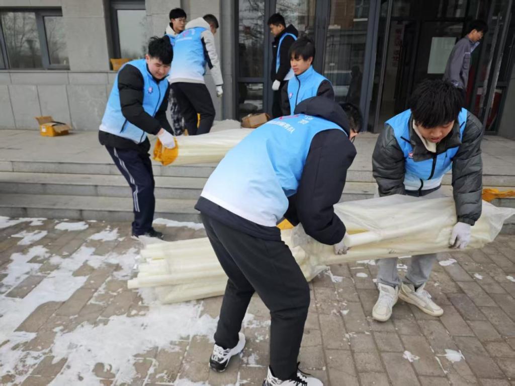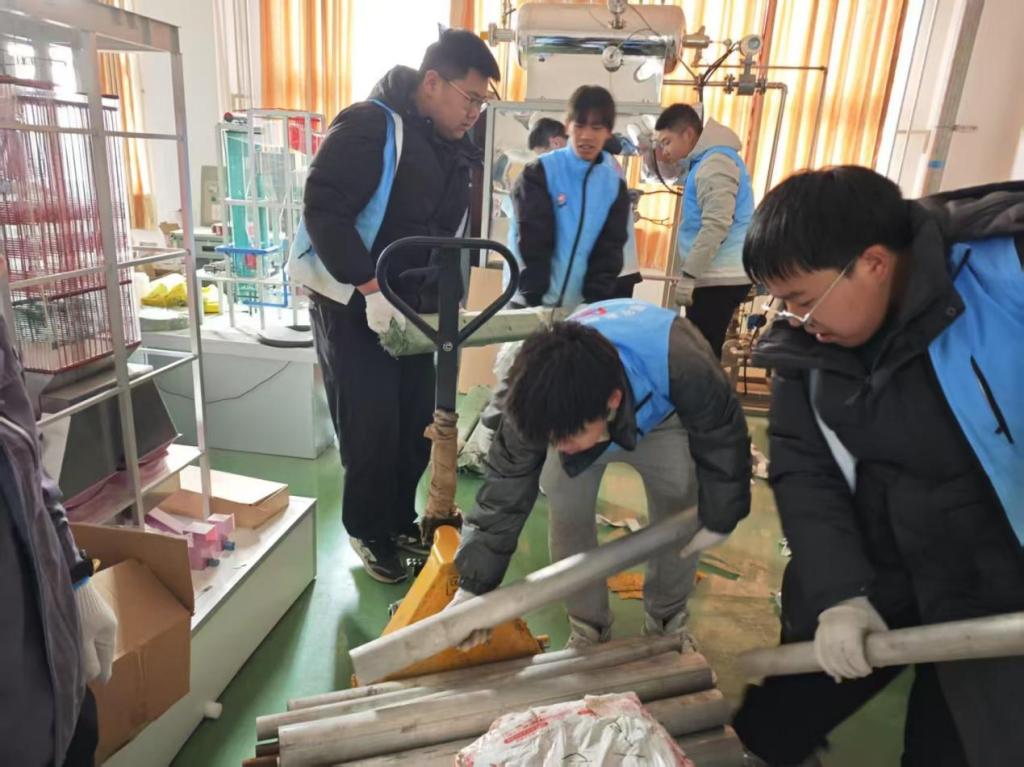志愿者们身着统一的蓝色志愿服,分工明确,有序清理杂物、擦拭设备、整理工具,为师生们营造了更加整洁、有序的教学实践环境。
