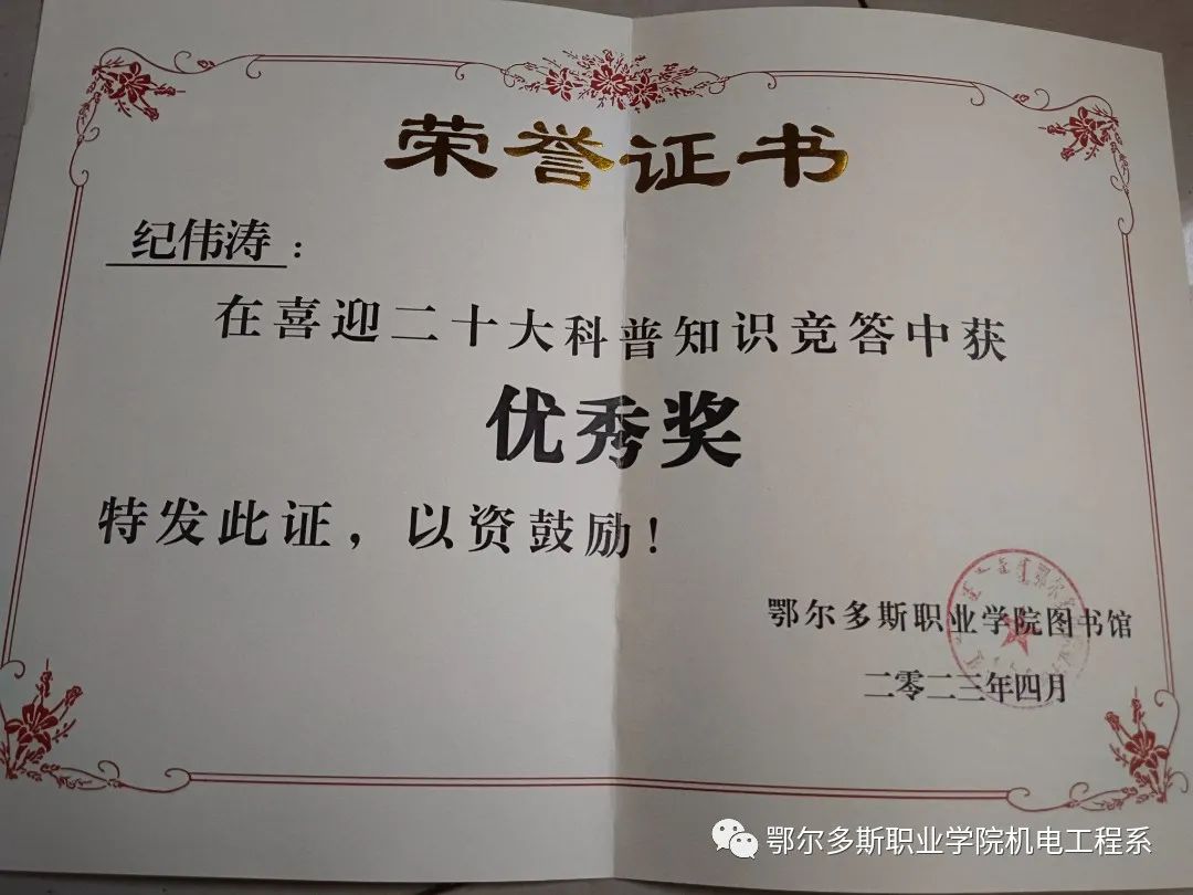 纪伟涛,男,汉族,2003年12月生,共青团员,现任开云手机官方版在线入口机电工程系团总支副书记、机电工程系学生会负责人、机电工程系22级机电一体化技术五班班长。在校期间曾获院级“三好学生”、“优秀共青团员”等称号,带领所在团支部荣获“五四红旗团支部”称号,获学院《铸牢中华民族共同体意识》实践课一等奖、学院《思想道德与法治》实践课程一等奖。见贤思齐焉,纪伟涛用自己的经历和优秀成果证明,努力一定会有收获,向前走,一定会看到希望。努力的方向来源于以下几个方面:
