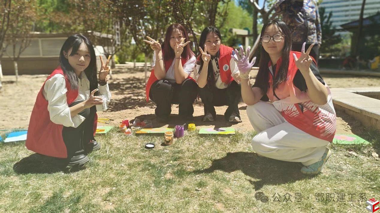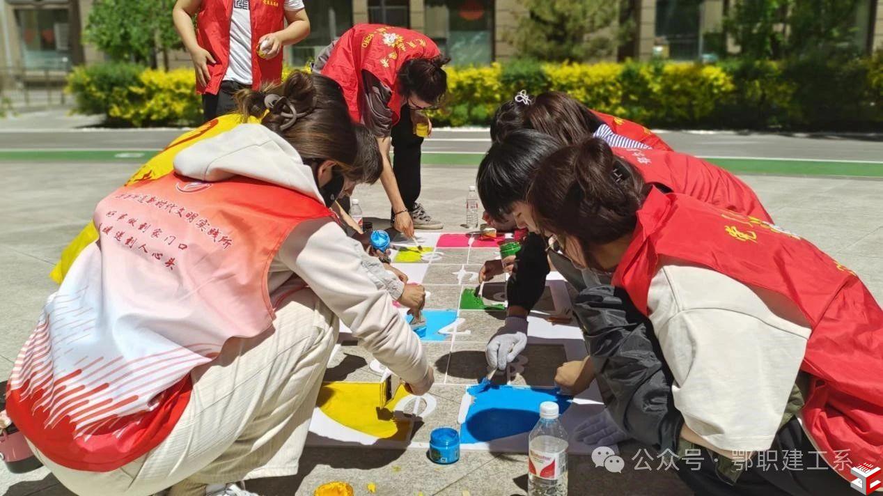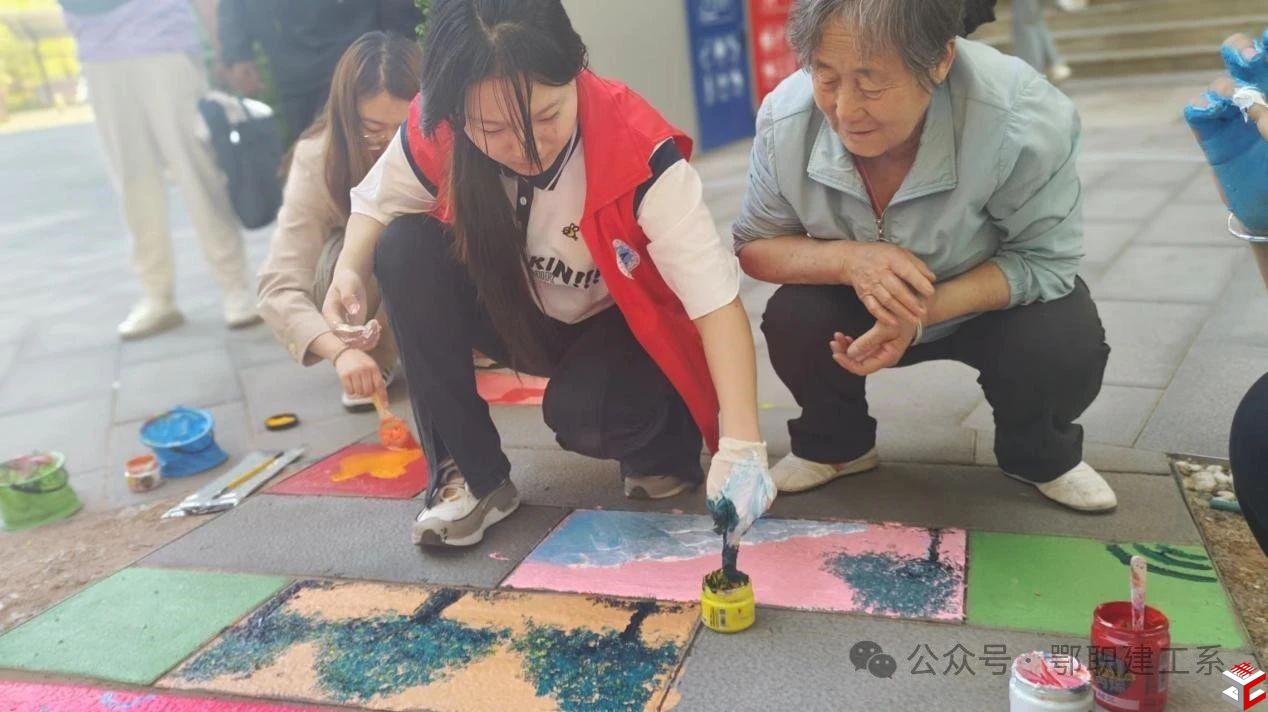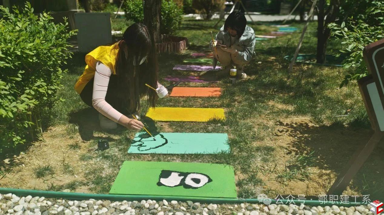 活动中,同学们以石砖小路为“画纸”,手执画笔半蹲在地,充分发挥想象力在路面、石阶上绘制美丽图案。湛蓝色的海洋、色彩鲜明的郁金香、各式各样的小动物……普通的石砖小路摇身一变成为了一道靓丽的风景线。