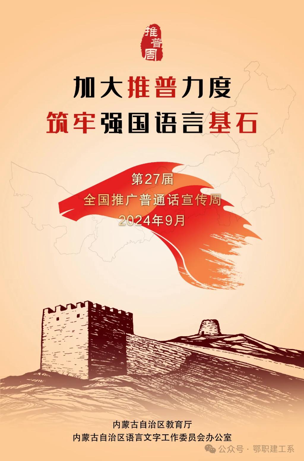 经国务院批准,自1998年起,每年9月第三周为全国推广普通话宣传周(简称推普周)。今年是第27届推普周,主题为“加大推普力度,筑牢强国语言基石”。内蒙古自治区教育厅、内蒙古自治区语言文字工作委员会办公室录制了推普公益宣传片,设计制作了推普公益宣传片和海报,一起来看!