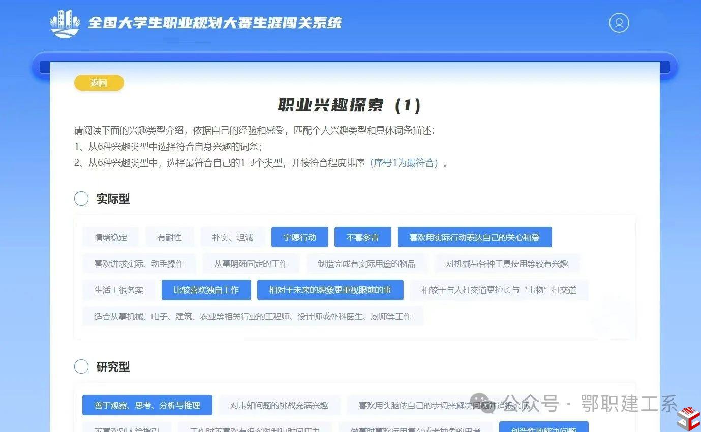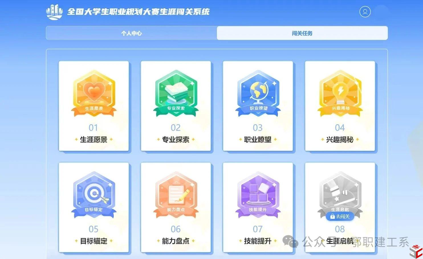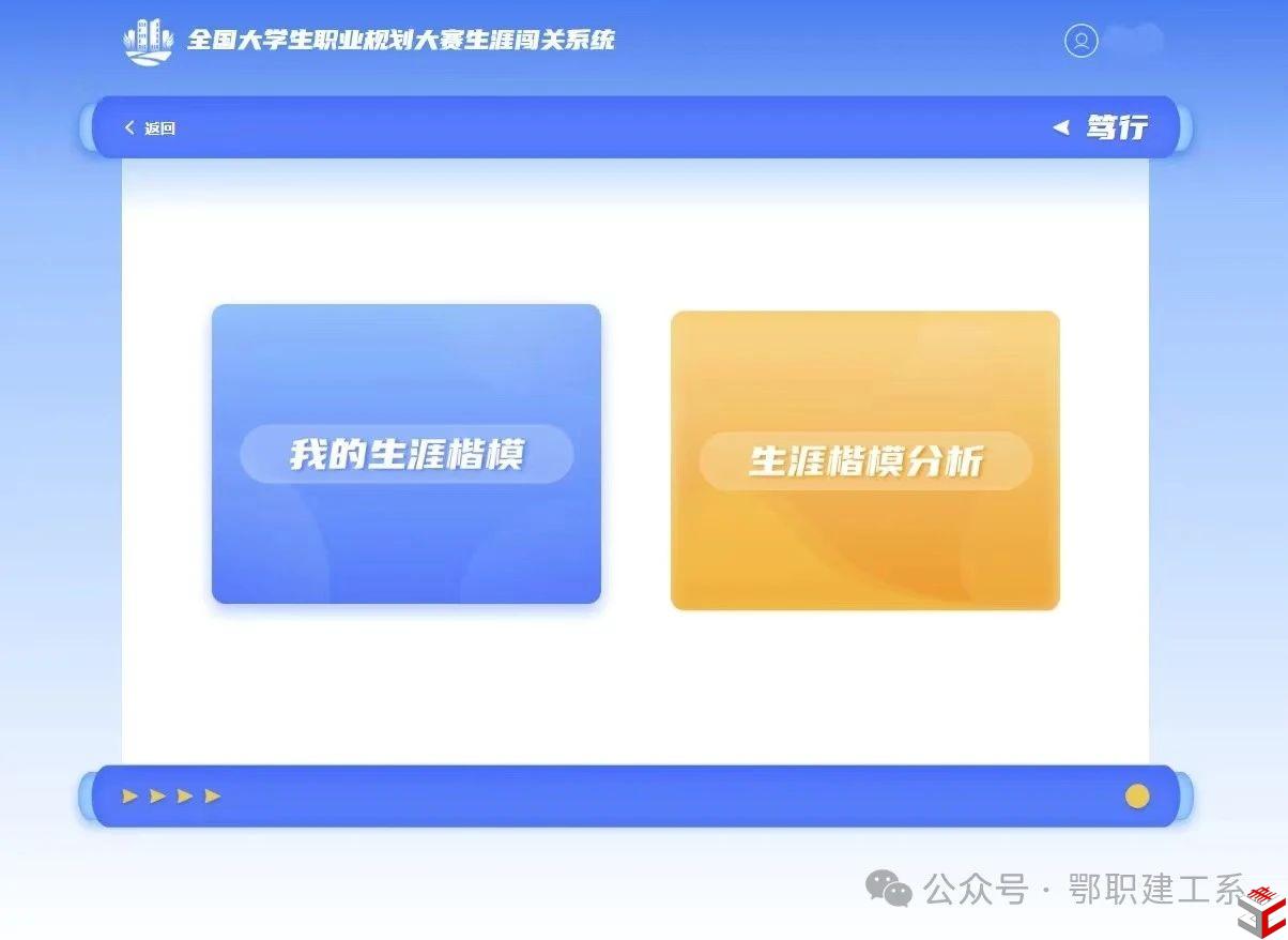 登录职规赛官网后,选择成长赛道的学生可以进入“生涯闯关”界面;选择就业赛道的学生可以进入“生涯闯关”和“职业测评”界面。