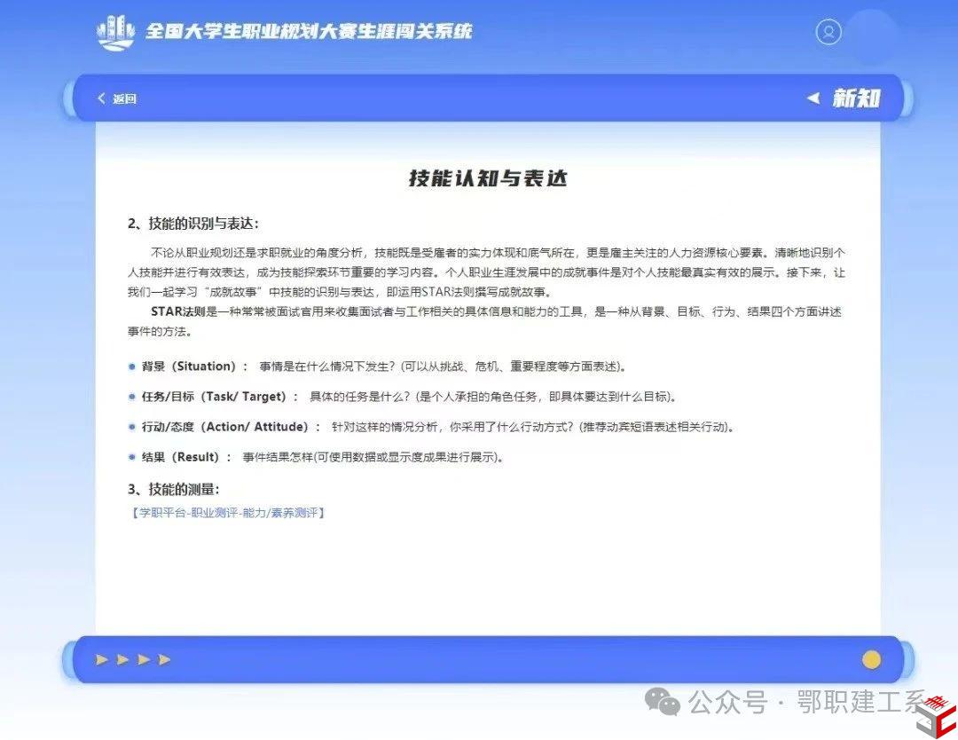 能力是指顺利完成一项活动任务的个性心理特征可以分为“能力倾向”和“技能”两类。“能力倾向”是指每个人先天展示的才能特长如音准、运动能力等它是与生俱来的。“技能”则是人们后天通过实践习得的能力。本关聚焦探索在后天实践中可提升的能力——技能。确认自己现在拥有的技能发现自己需要进一步拓展的技能是职业生涯规划中的关键环节大家快来挑战吧!