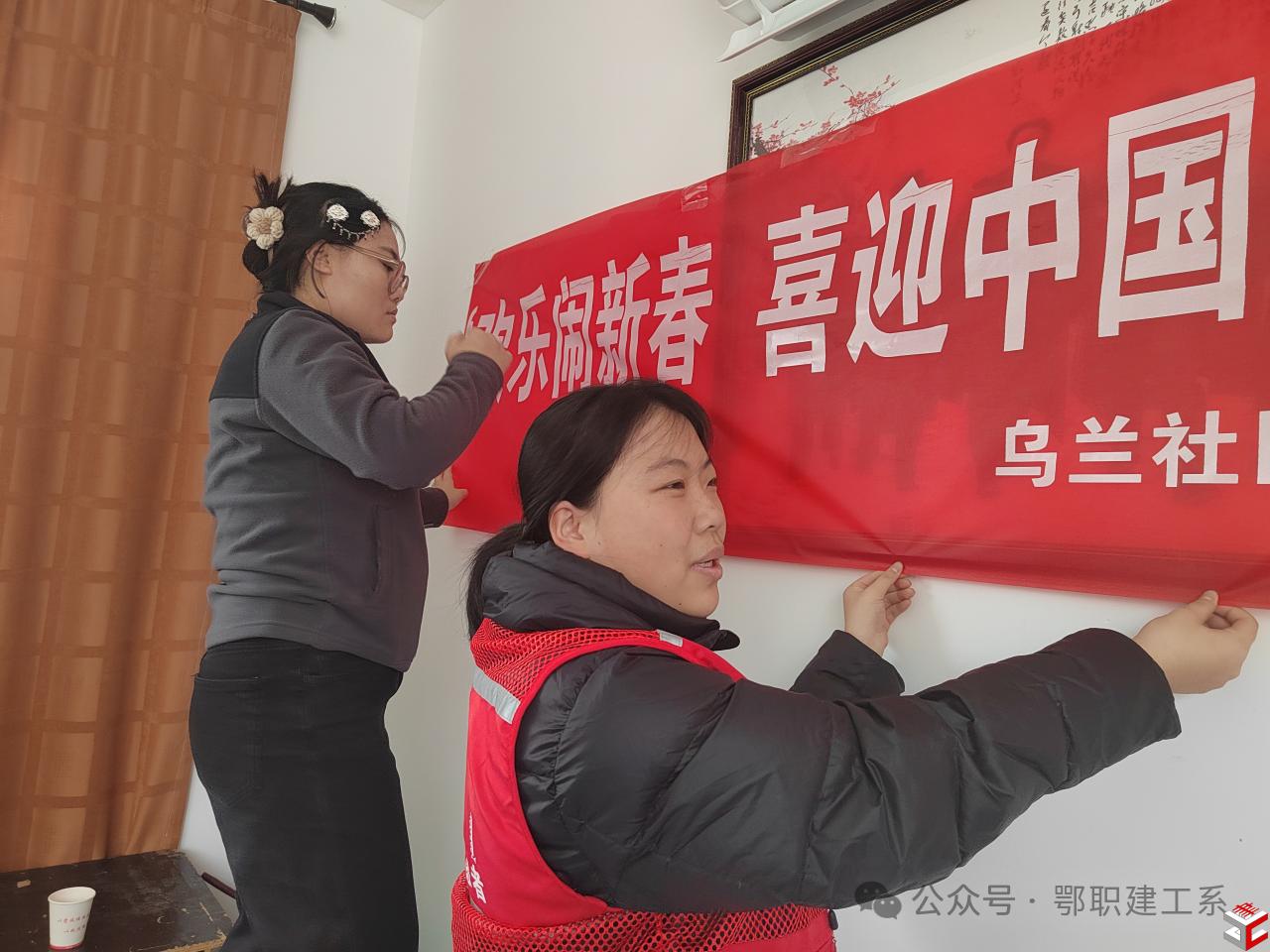 24级视觉传达设计班张画画同学参与了鄂托克旗乌兰社区新时代文明实践站举办的“欢乐闹新春 喜迎中国年”春节主题活动。活动筹备阶段,张贴喜庆的横幅,布置象征团圆吉祥的窗花,这次活动不仅让我们感受到了浓浓的年味,也让自己体会到了社区的凝聚力和邻里间的深厚情谊。