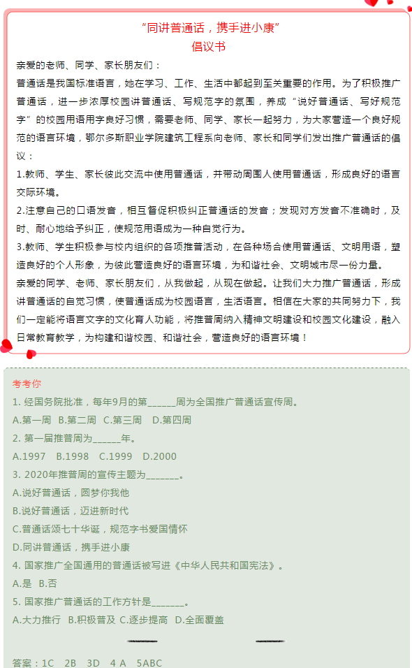 为做好第23届全国推广普通话宣传周活动,全面、深入宣传国家推广普通话的政策法规,积极引导师生树立科学的语言观,为构建校园文化建设营造良好的语言环境,建工系开展系列活动,现总结如下: