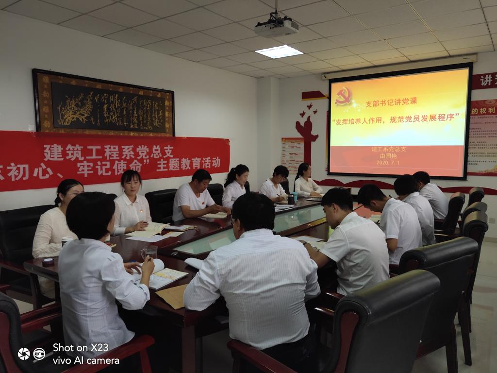 本次主题党日活动分为四部分。一是集中学习战“疫”示范微党课。通过学习战“疫”示范微党课,所有党员深深地被战“疫”英雄们的事迹激励、引领,增强了党员们在战疫的危机和大考中践行初心使命的决心,自觉在校园疫情防控阻击战中强化责任担当,牢固筑起校园红色防火墙。二是重温入党誓词。全体党员回顾了庄严承诺和奋斗初心。三是发放抗疫捐款收据。新冠肺炎疫情发生以来,建筑工程系党总支响应组织号召积极捐款。支部书记由国艳将一张张印有中组部红色印章的“捐款收据”发放到党员手中,这些“捐款收据”是建工系每一个党员主动支持国家抗疫工作的见证。四是支部书记讲党课,由国艳同志从发展党员程序、培养人工作要求、入党介绍人作用及要求、规范会议四个方面详细讲解了发展党员的工作流程,为进一步规范系部党员发展工作奠定了基础。