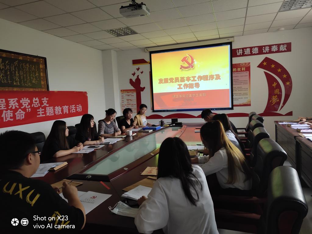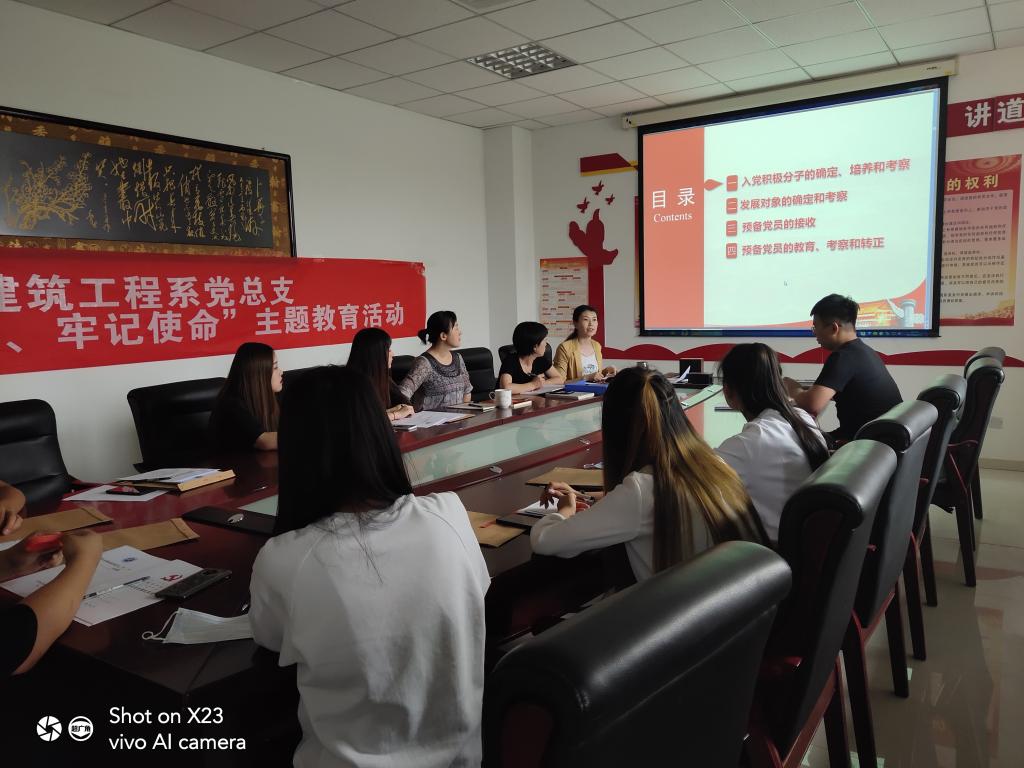 2020年6月22日晚,建筑工程系党总支组织开展入党积极分子入党相关知识培训。本次培训由韩旭老师主持,学工支部老师及全体入党积极分子参加。