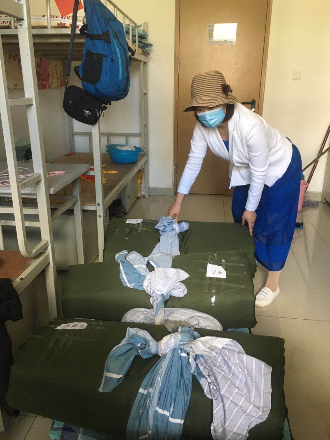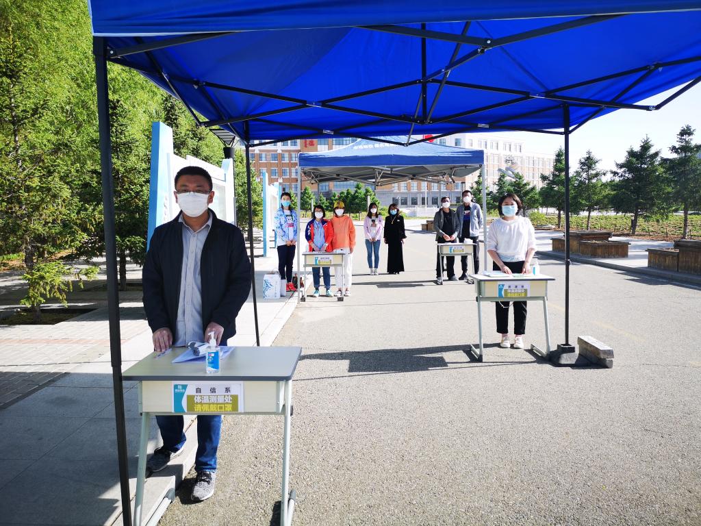 老师们分别在车站、校门口、宿舍几个点进行接待,学生到校在工作人员的指引下,通过门口测温、核验身份、提交承诺书、二次测温后有序进入校园。