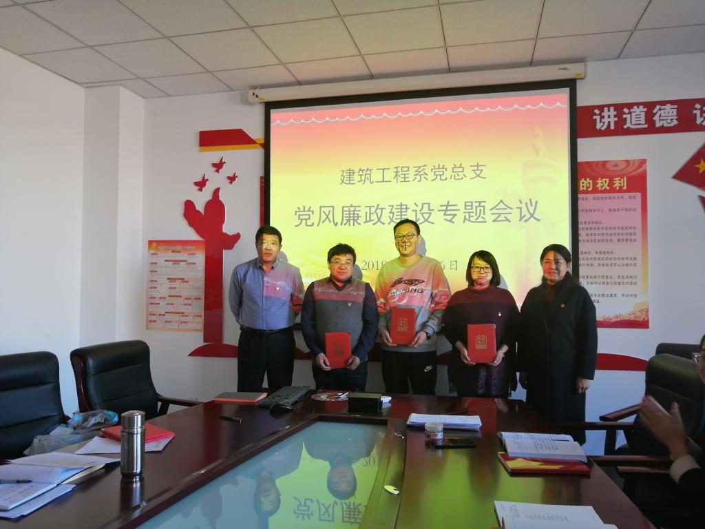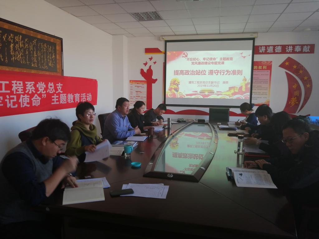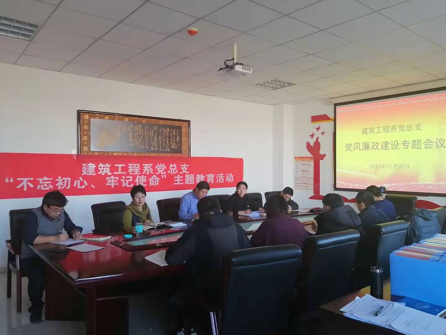 2019年11月26日,建筑工程系党总支在教研楼325会议室召开“不忘初心,牢记使命”主题教育党风廉政建设专题会议。党总支副书记薛英主持,全体党员参加。