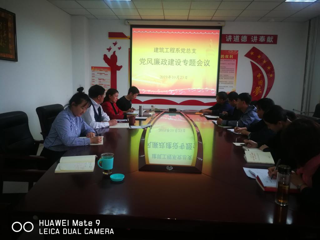 2019年10月23日,建筑工程系党总支在教研楼325会议室召开“不忘初心,牢记使命” 主题教育党风廉政建设专题学习会议。党总支副书记薛英主持,全体党员参加。
