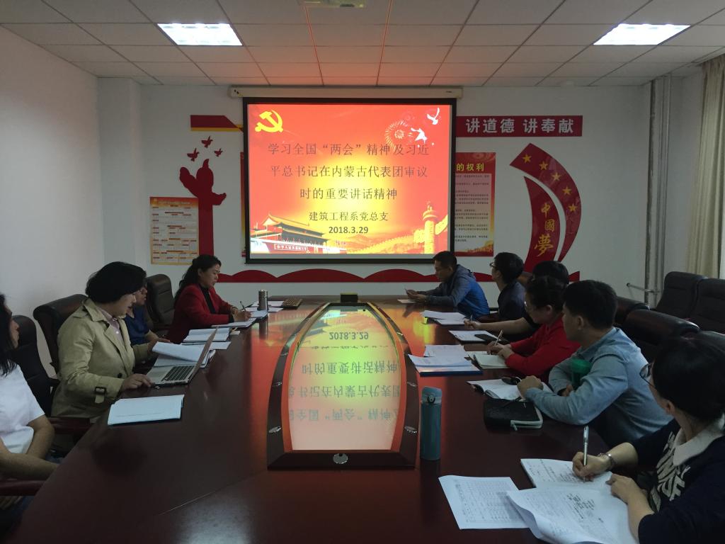 3月29日下午,建筑工程系党总支在教研楼325会议室,组织全体教师学习全国“两会”精神及习近平总书记在内蒙古代表团审议时的重要讲话精神。会议由党总支副书记薛英同志主持。