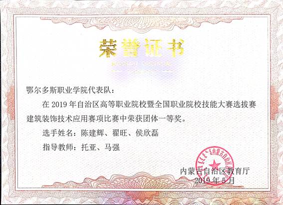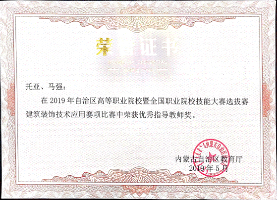 2019年4月,室内设计工作室教师团队精心组织培训,不辞辛劳,指导建筑室内设计专业学生9名,陈建辉、翟旺、侯欣磊同学荣获“首届全国建筑装饰应用技术大赛内蒙古选拔赛”一等奖。学院荣获优秀组织奖。托亚、马强老师荣获内蒙古自治区教育厅颁发的优秀指导教师奖。