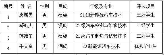通过班级推荐、评议小组评选、系部党政联席会议决定,以下同学荣获汽车工程系“四优”荣誉: